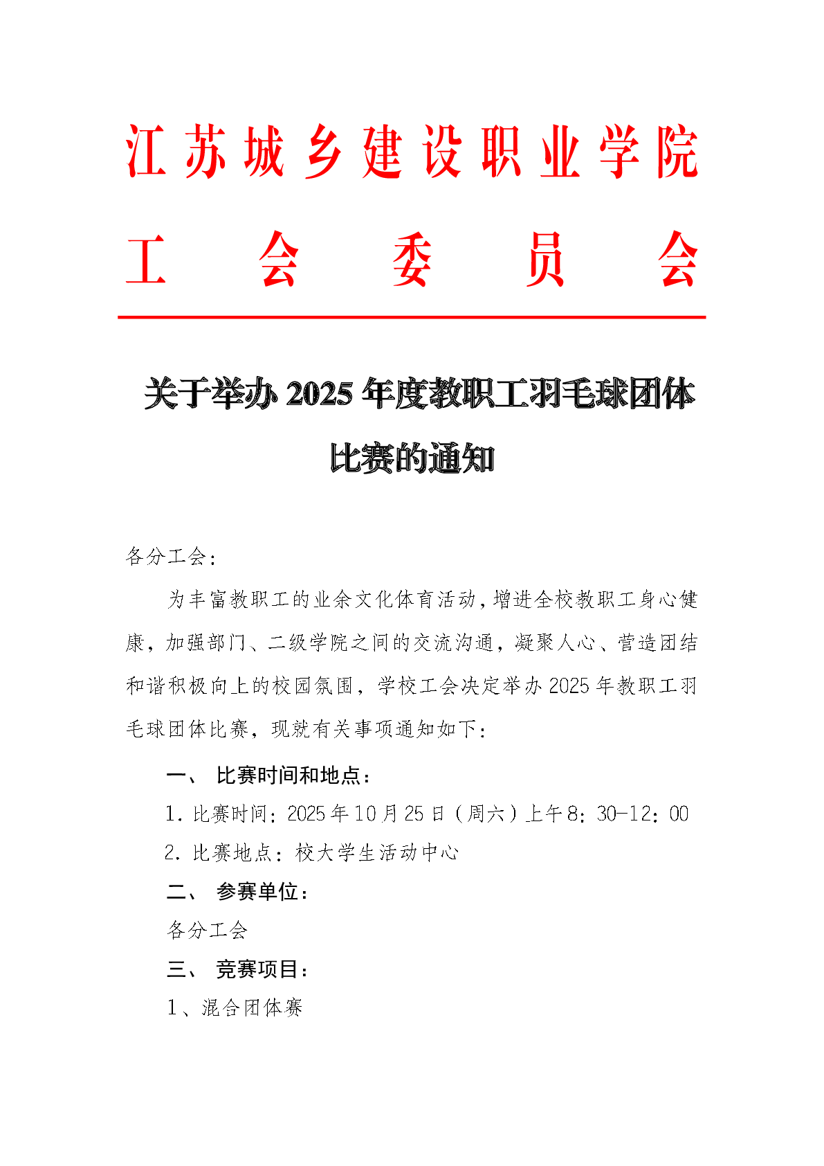 关于举办2025年度教职工羽毛球团体比赛的通知